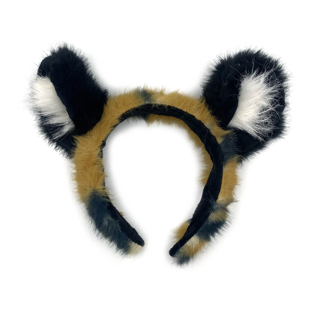 Covered in soft faux fur with a striking mix of black, white, and brown, this headband captures the unique markings of the African wild dog.