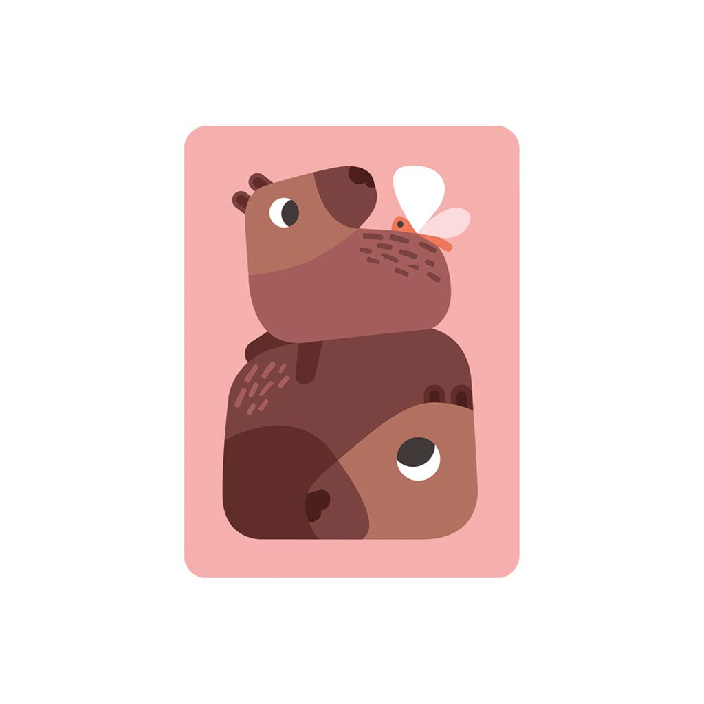 Featuring a playful baby capybara sitting on top of it's mother back, peeking at a butterfly, this item would be suitable for framing and hanging up - complimenting an animal themed nursery, playroom, or bedroom.