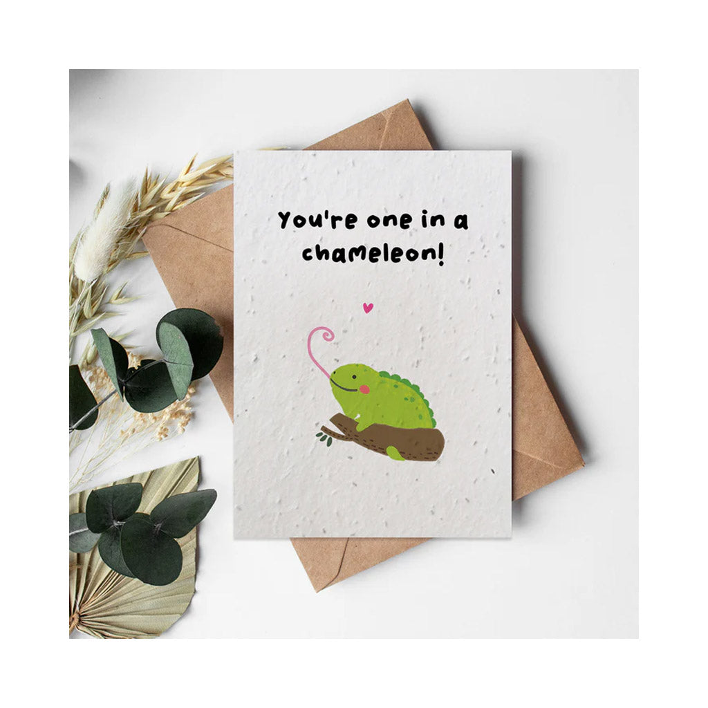 Show your affection to someone special with a sweet chameleon greeting card. This eco-friendly card can be planted into the soil after use. As the paper decomposes, the seeds germinate and grow into wildflowers.