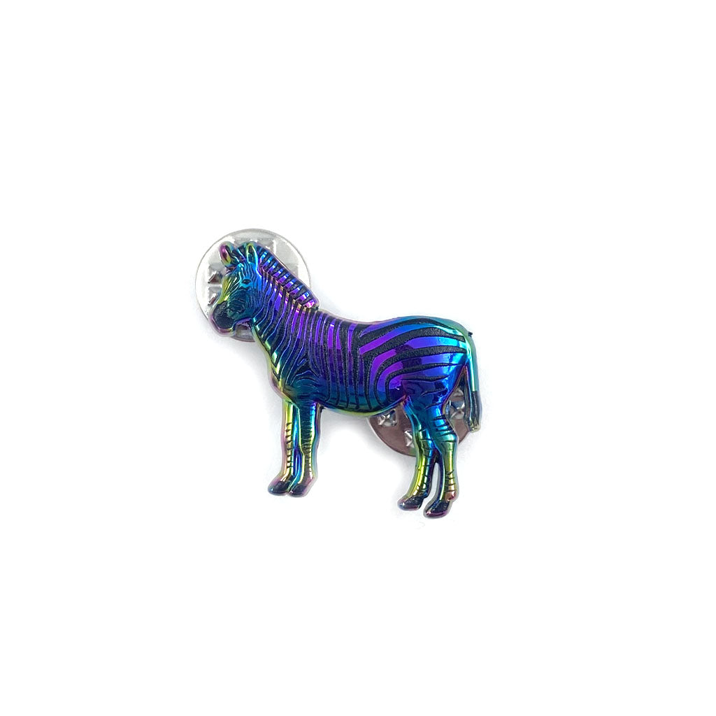 Made from durable metal and featuring a detailed zebra design with a shiny iridescent rainbow look finish, this pin badge is perfect for personalizing jackets, bags, and more.