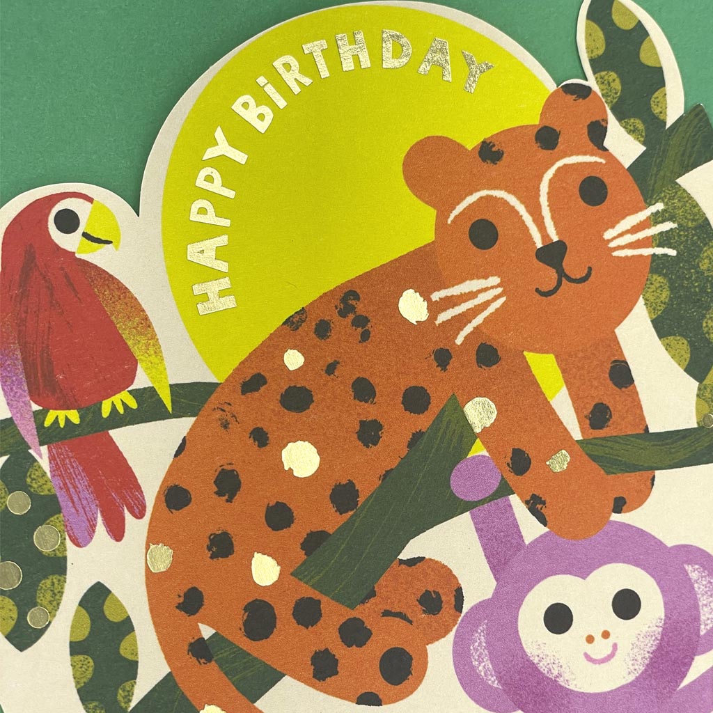 This card features a lively jungle scene, packed with popular animals, including a tiger that is climbing a tree, a leaping frog, blue lizard, purple monkey and more. Children will enjoy opening the fold out flap to discover more jungle themed surprises.