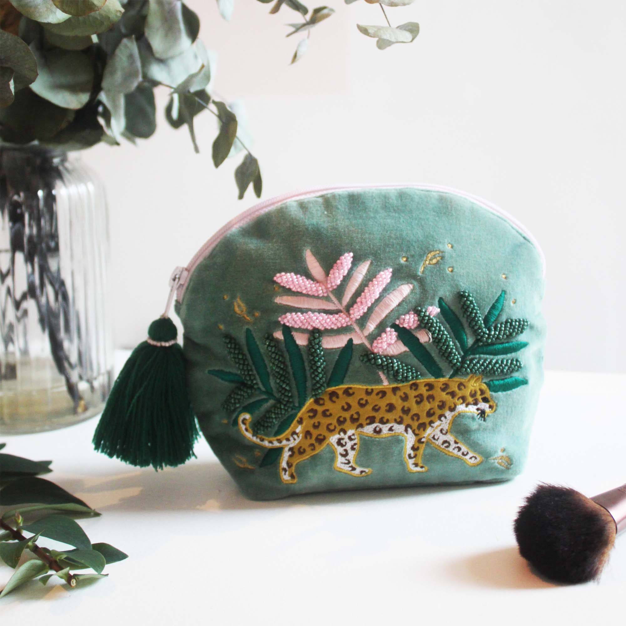 Made from sage green velvet, this cosmetic bag features cheetah and foliage embroidery. Details such as a metallic thread, glass beads, and a woollen tassel add beautiful finishing touches.