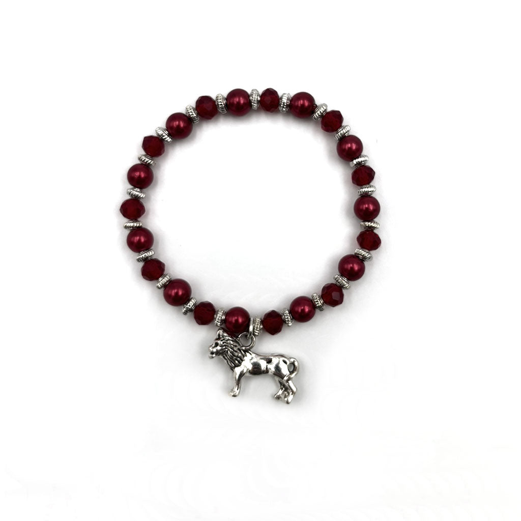 This lion bracelet features red and silver beads, along with a small lion pendant.