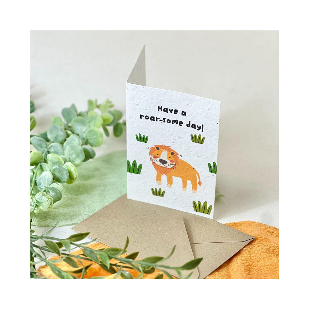 Wish someone a 'roar-some day' with this cute lion greeting card. This eco-friendly card can be planted into the soil after use. As the paper decomposes, the seeds germinate and grow into wildflowers.