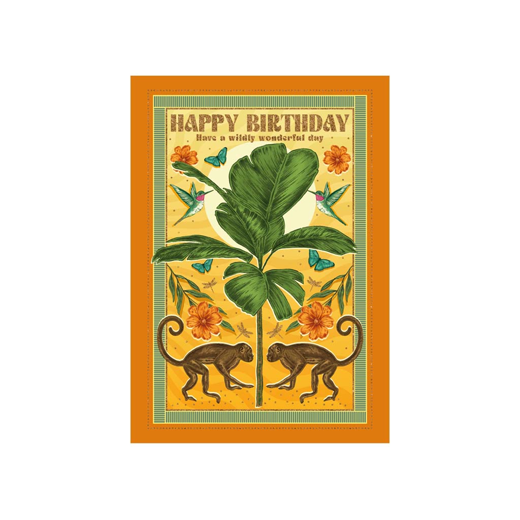 The card features monkeys crawling among lush foliage, with colourful birds and butterflies flying above. Warm colours bring a tropical summery feel to brighten up anyone's special day. Foil detailing on the writing adds a lovely tactile finish.