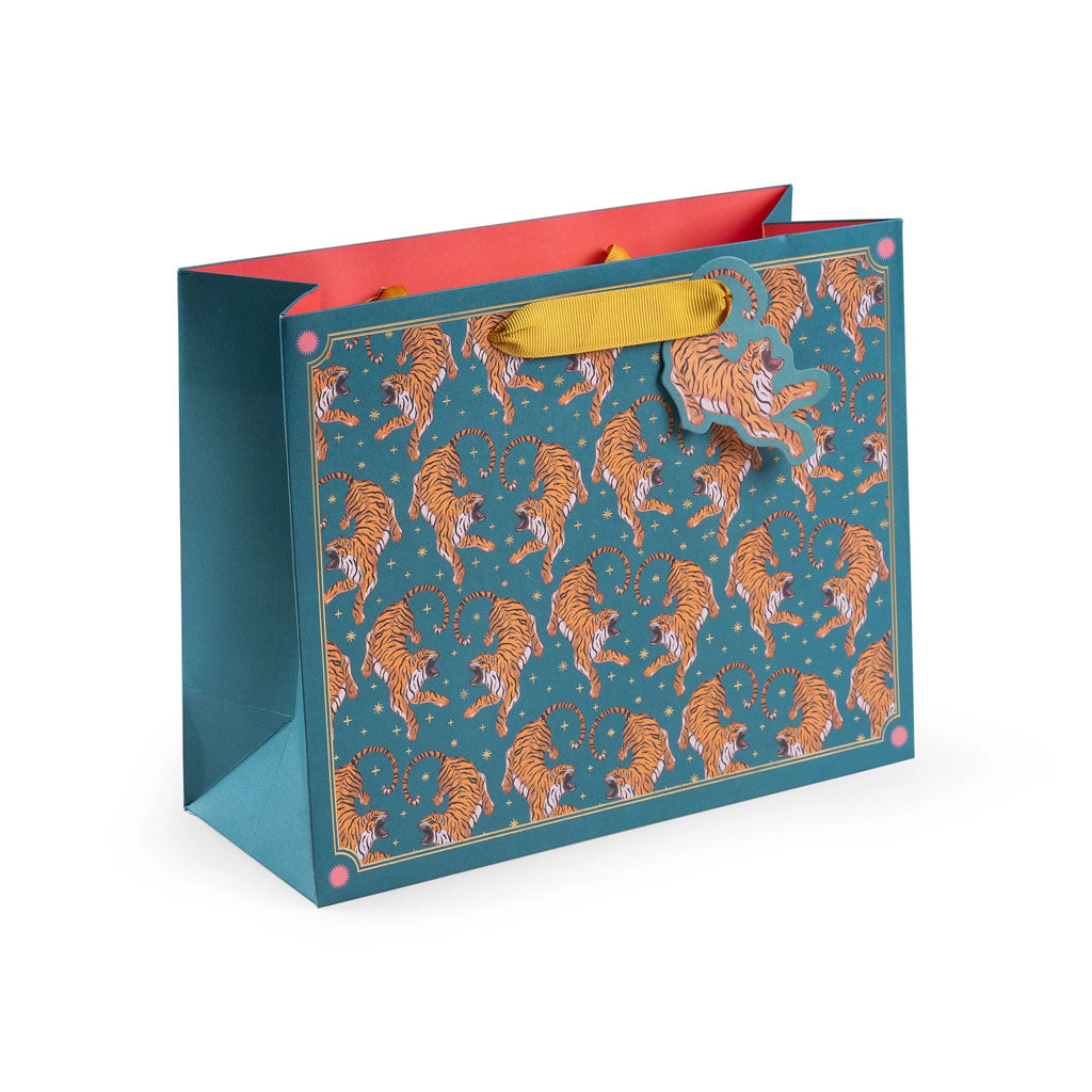 A medium sized premium gift bag adorned with an exquisite symmetrical tiger print. It also features yellow handles and a matching tiger gift tag.
