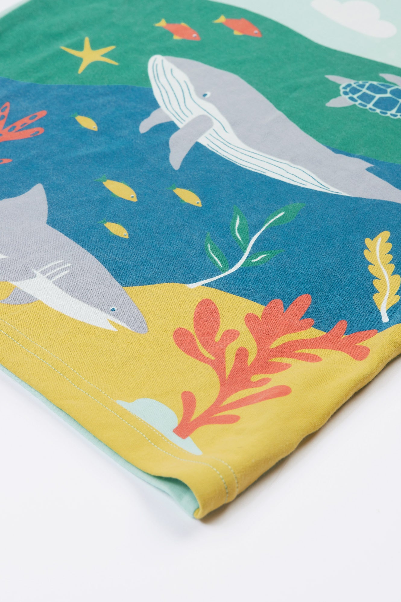 The cleverly designed sea life print showcases the amazing creatures living in different ocean layers.