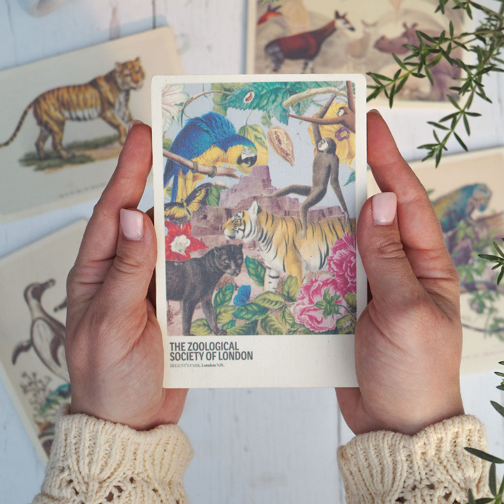 Created in celebration of ZSL’s 200th anniversary, this unique wooden postcard features a vibrant collage of wildlife and botanical illustrations, using historic artwork from ZSL’s archives.