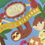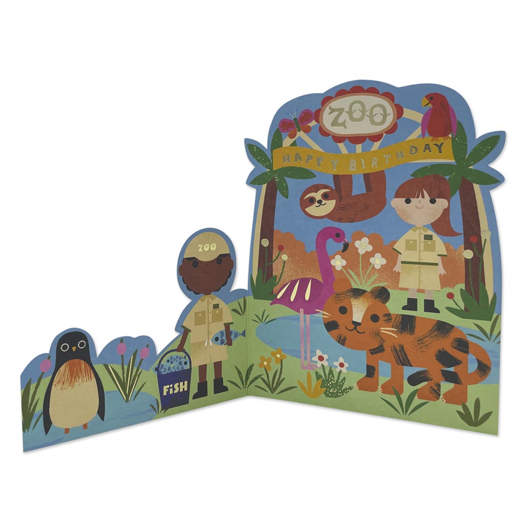 This card features a lively Zoo scene, packed with popular animals, including a sloth hanging from a happy Birthday banner. Open the playful fold out flap to discover a tiger hiding behind a pond!
